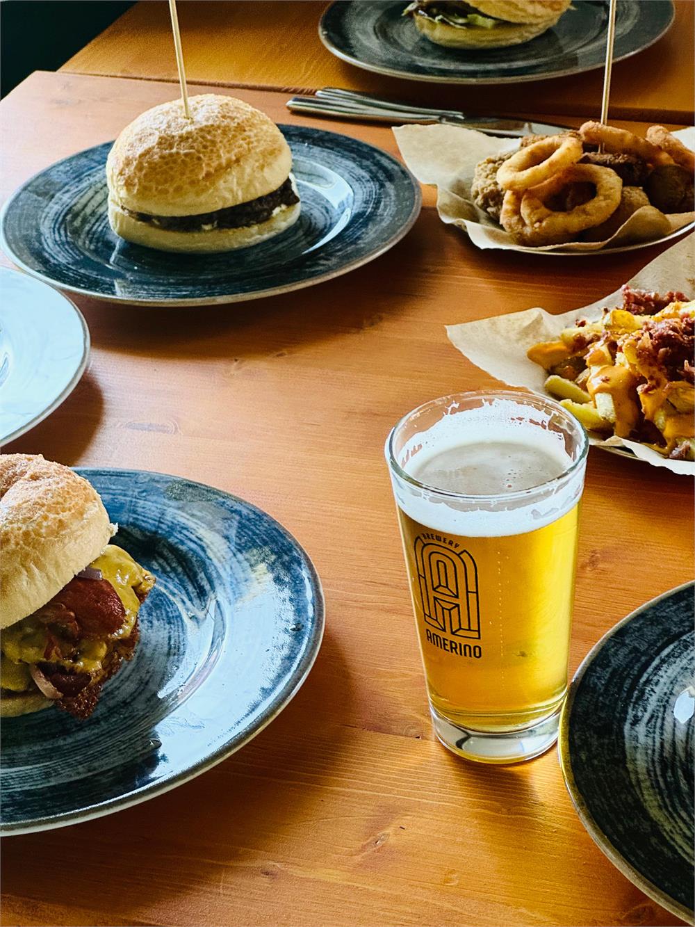 Casa Amerino propone un menù variegato che sposa la tradizione della cucina da pub con la qualità delle materie prime e il rispetto della stagionalità. Tra le proposte i classici taglieri misti di salumi e formaggi, smash burger, club sandwich, focacce miste e sfiziosità fritte, tutti piatti pensati per accompagnare alla perfezione ogni birra disponibile alla spina. Il locale dispone di un impianto a sei vie, attraverso il quale a rotazione vengono servite le sedici birre prodotte dal birrificio. Tra queste spiccano la Mario Rossi, una bionda classica dal tenore alcolico di 5,2%, la Northup, una saison belga dal 7% di alcol, e la Masika, una double IPA americana che raggiunge l’8%. Non mancano le birre acide alla frutta e l’ultima nata, la Shhhh, un’American Lager realizzata in collaborazione con Fermentis, multinazionale leader nel settore dei lieviti. Ogni birra nasce da una continua ricerca e sperimentazione, con l’obiettivo di ottenere il giusto equilibrio tra gusto e originalità, soddisfacendo sia i palati più esperti che i neofiti della birra artigianale. Casa Amerino non vuole essere solo un pub, ma un luogo d’incontro e condivisione, un indirizzo nuovo e inedito nel panorama della bassa Umbria. Il locale, con vista sull’impianto di produzione, offre un ambiente accogliente e familiare, perfetto sia per giovani in cerca di una serata in compagnia, sia per chi vuole scoprire prodotti locali di qualità.